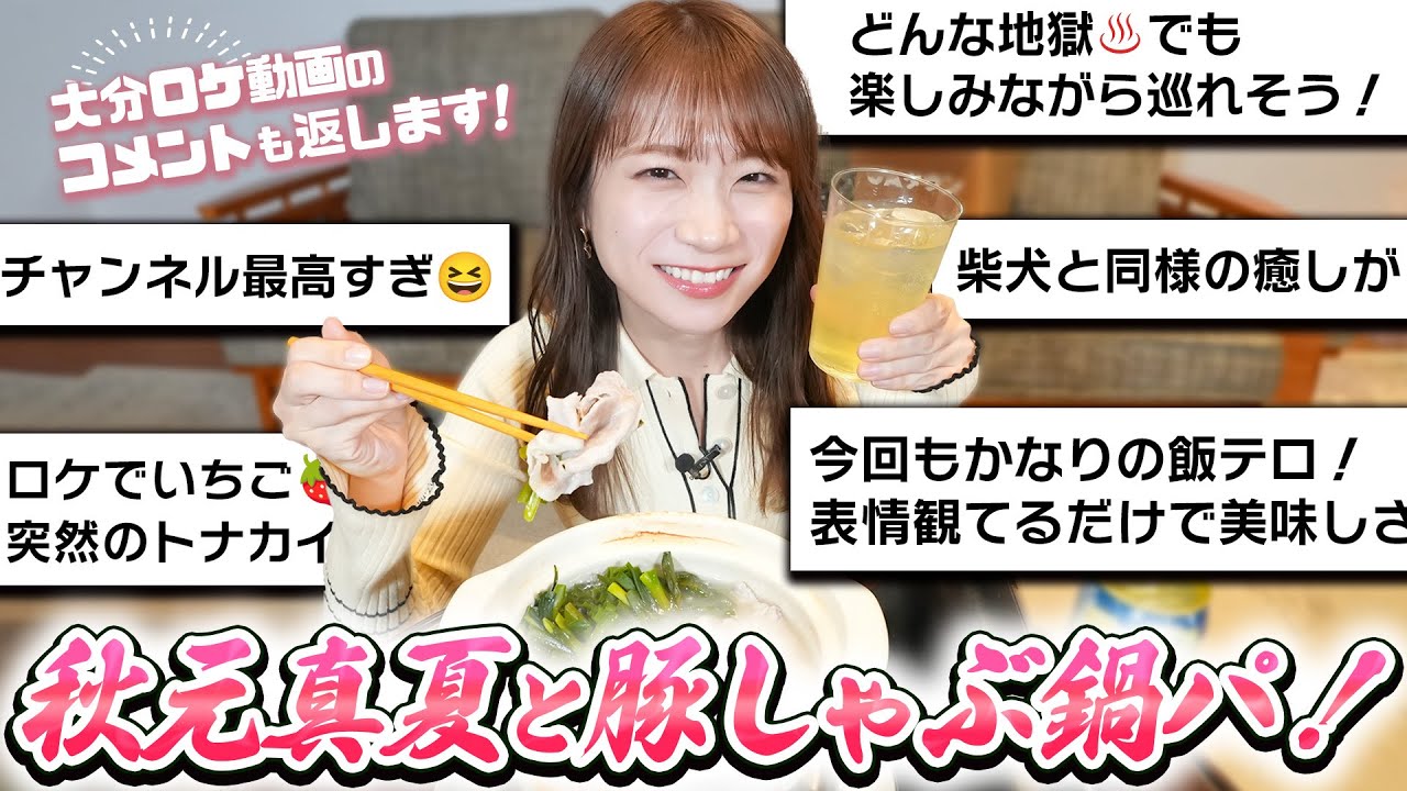 こんばんは。今日も楽しく観ています。大分ロケも桜王の豚肉、小ネギ、ゆず胡椒も柑橘系のお鍋料理美味しそうですね。大分は温泉で有名で静岡の伊東や熱海、修善寺温泉に似て、いい所ですね。食材の農産物も美味しくてお酒にあいますね。真夏さん料理の食レポもお上手で食材の味を上手く出して、レポートして貰えるもので、見て食べたくなります、食レポしてる時の真夏さん楽しそうで、かわいいです。真夏さんとお食事したいです。真夏さんかわいいし、きれいです、楽しくなります。彼女だったら、大切にしたいですね。これかも応援します。真夏さんよろしくお願いします。ゆるふわチャンネルも。頑張りましょうね。次回のゆるふわチャンネル楽しみです。真夏さん好きです。