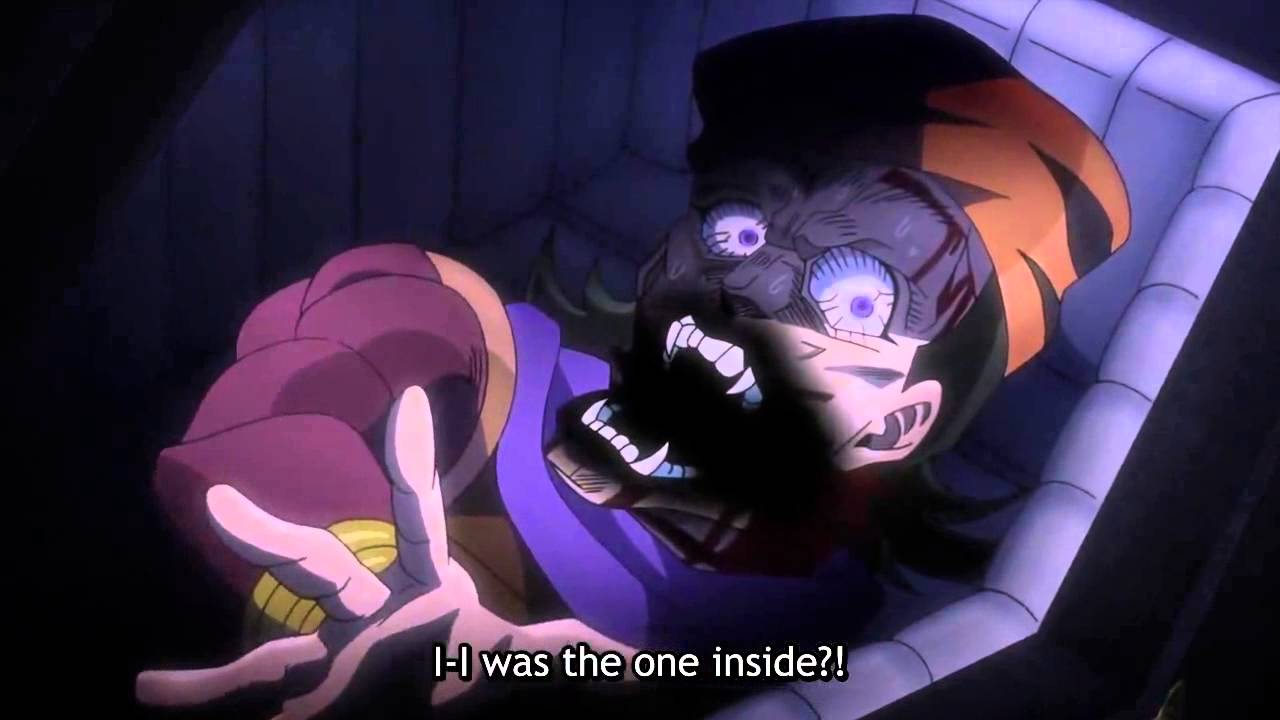 The thing I like more about the OVA than the Anime and Manga is that Avdol is the one inside the coffin instead of… Nutsack or whatever his name was. Because that scene literally gives me the chills the way the OVA set it up.