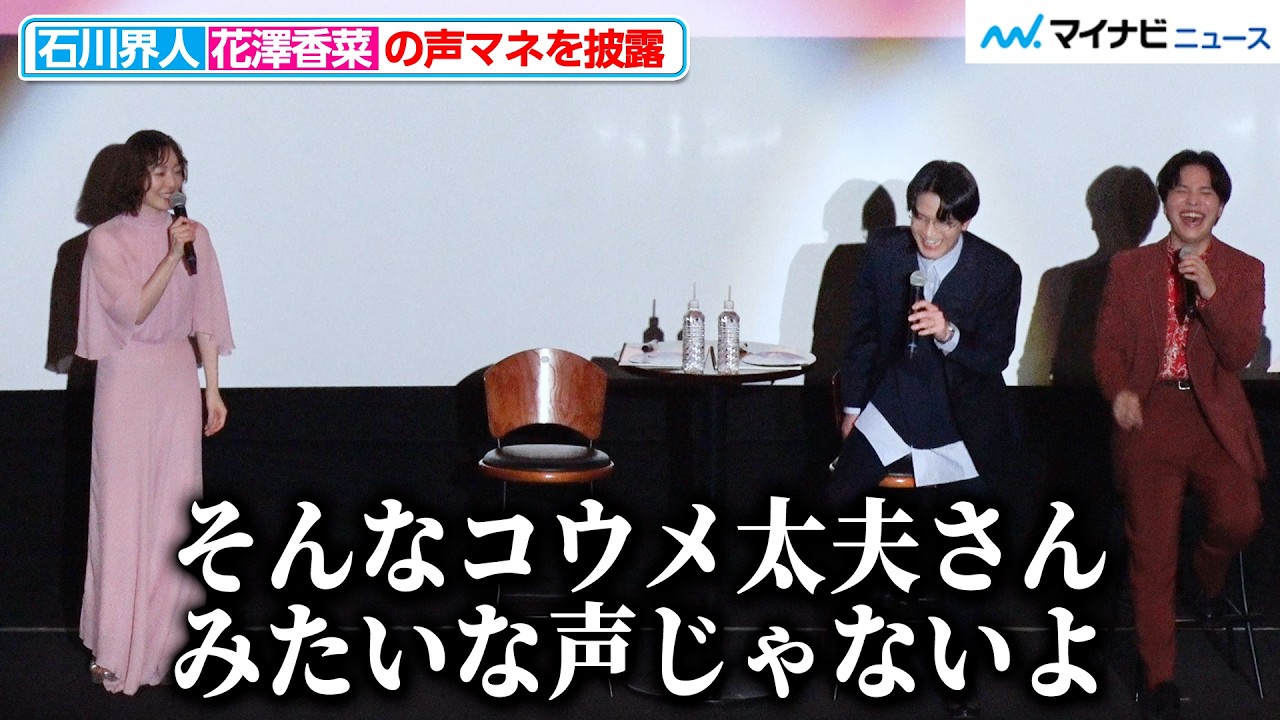 花澤香菜(仲間凛子役)、石川界人(佐槻鏡斗役)、石谷春貴(右沙田春真役)、エンディングテーマを歌う『ユイカ』が14日、 『ただいま、おじゃまされます!』舞台挨拶付き先行上映会に登壇。作品の魅力や、裏話を語った。