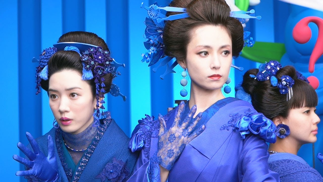 UQ三姉妹でおなじみの深田さん(長女)、多部さん(次女)、永野さん(三女)が、青い着物をまとい華やかに登場。さらに、ブルーガチャ(ママ)とブルームク(パパ)は巨大な彫刻のような姿で登場し、「+5G」と唱える。