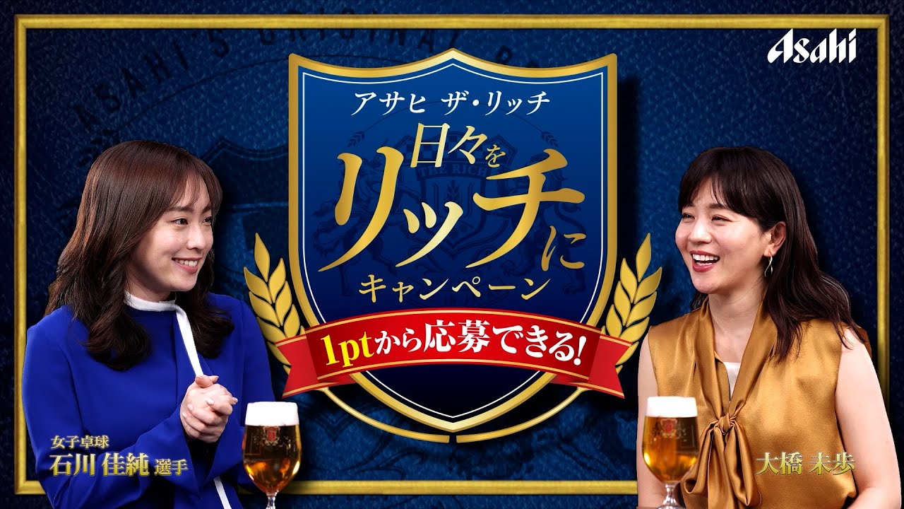 卓球 石川佳純選手、大橋未歩さんが出演する「アサヒ ザ・リッチ 日々をリッチにキャンペーン」のWebCM 出演者:石川佳純、大橋未歩 ▼アサヒ ザリッチ ブランドサイト https://www.asahibeer.co.jp/rich/ Tags:アサヒアサヒ ザ・リッチアサヒビール大橋未歩店頭VTR石川佳純 コメントを残すコメントを投稿するにはログインしてください。