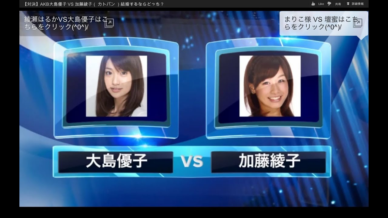 大島優子ならイイネボタンを、加藤綾子ならダメネボタンを、それぞれ押下。こんな感じでYouTubeでも統計とったら面白いのに。