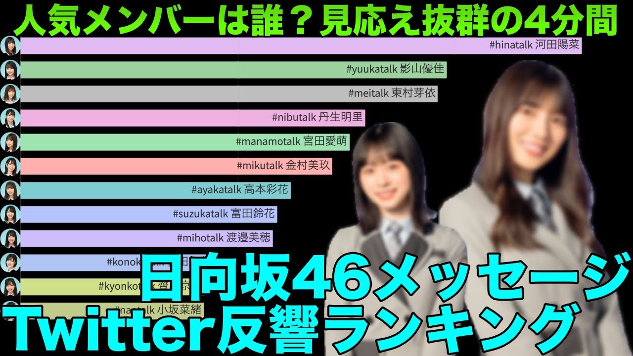 モバイルアプリ「日向坂46メッセージ」にて各メンバーがメッセージを送信した際のTwitter上での反響ランキングです。誰のを取るか迷っている場合の参考に!