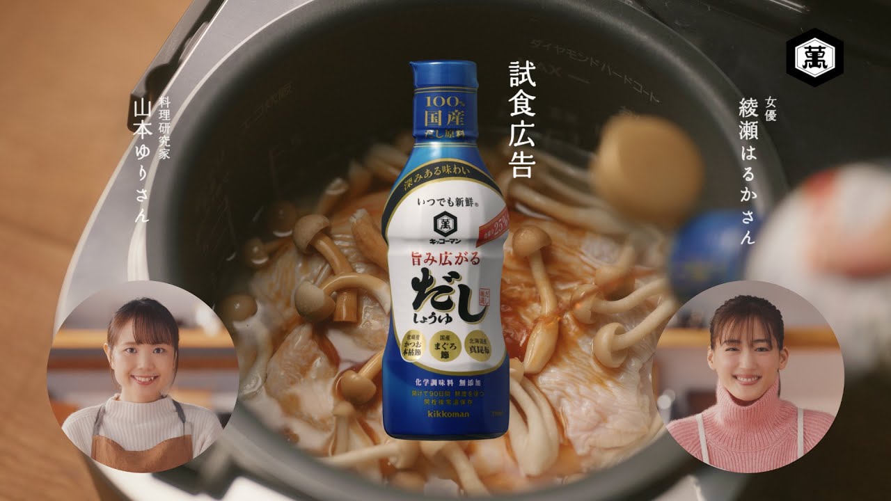 綾瀬はるかさん、山本ゆりさん出演の「キッコーマン いつでも新鮮 旨み広がるだししょうゆ」のCMです。