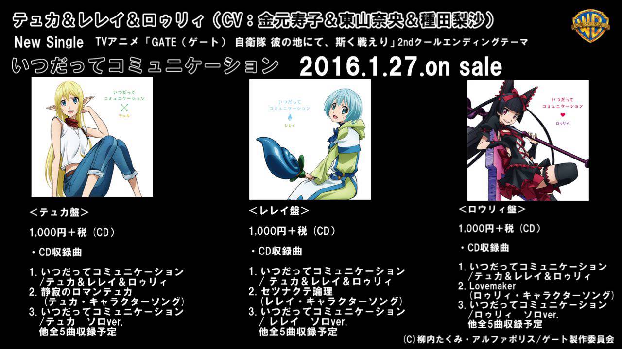2016月1月27日発売 テュカ&レレイ&ロゥリィ (CV:金元寿子&東山奈央&種田梨沙) New Single「いつだってコミュニケーション」(TVアニメ「GATE(ゲート) 自衛隊 彼の地にて、斯く戦えり 」新EDテーマ)の音源試聴です。