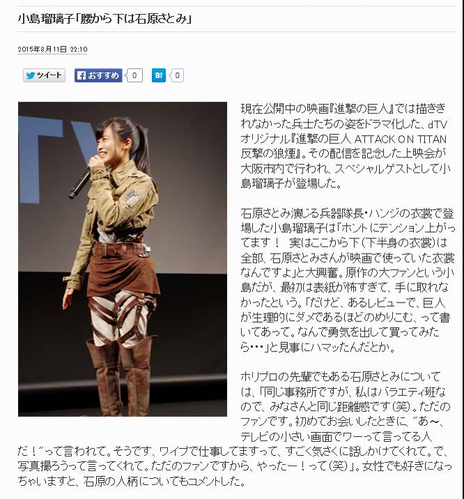 現在公開中の映画『進撃の巨人』では描ききれなかった兵士たちの姿をドラマ化した、dTVオリジナル『進撃の巨人 ATTACK ON TITAN 反撃の狼煙』。その配信を記念した上映会が大阪市内で行われ、スペシャルゲストとして小島瑠璃子が登場した。
