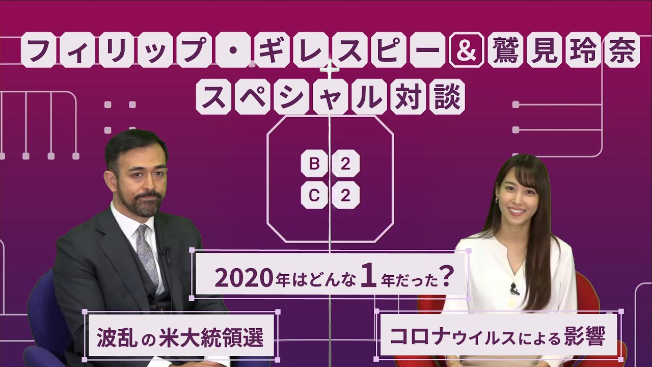SBI FXトレードとSBI VCトレード、共通イメージキャラクターの鷲見玲奈さんとB2C2 Japan代表取締役社長であるフィリップ・ギレスピーさんのスペシャル対談です。今回は2020年はどのような1年だったかについて解説していています