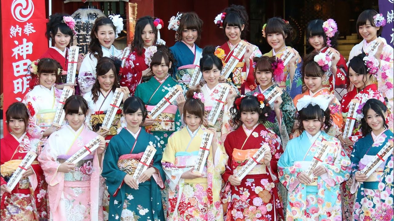 AKB48の川栄李奈さん、岩佐美咲さん、武藤十夢さんら「AKB48」グループの新成人メンバー22人が成人の日の1月12日、神田明神(東京都千代田区)に色とりどりの振り袖姿で登場した。