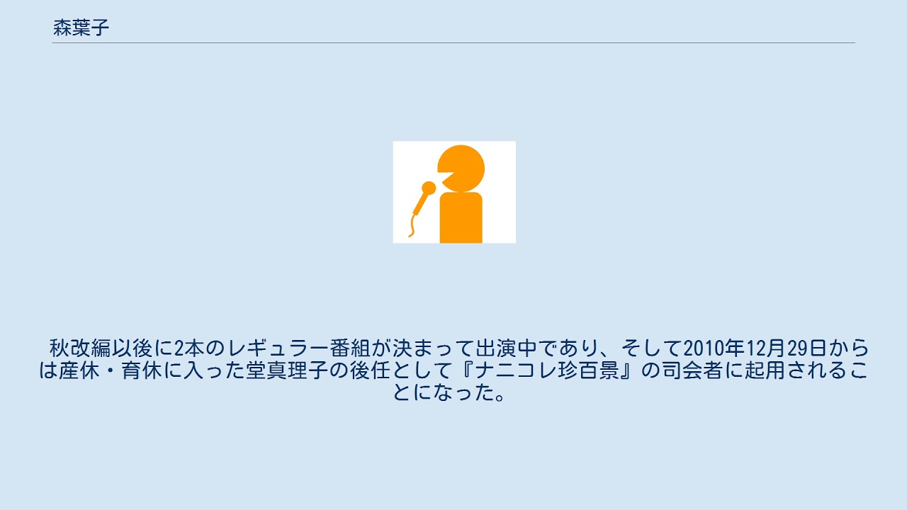 秋改編以後に2本のレギュラー番組が決まって出演中であり、そして2010年12月29日からは産休・育休に入った堂真理子の後任として『ナニコレ珍百景』の司会者に起用されることになった。