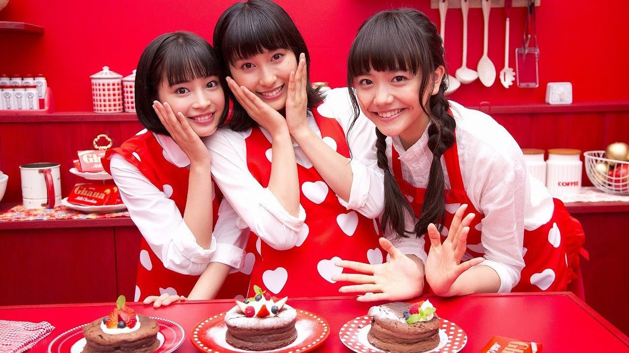 新CMでは、広瀬さん、土屋さん、松井さんの3人がハート柄のおそろいのエプロンを着け、真っ赤な壁紙のキッチンで「ガトーショコラ」「ハートの生チョコケーキ」「デコカップチョコ」の手作りに挑戦している。