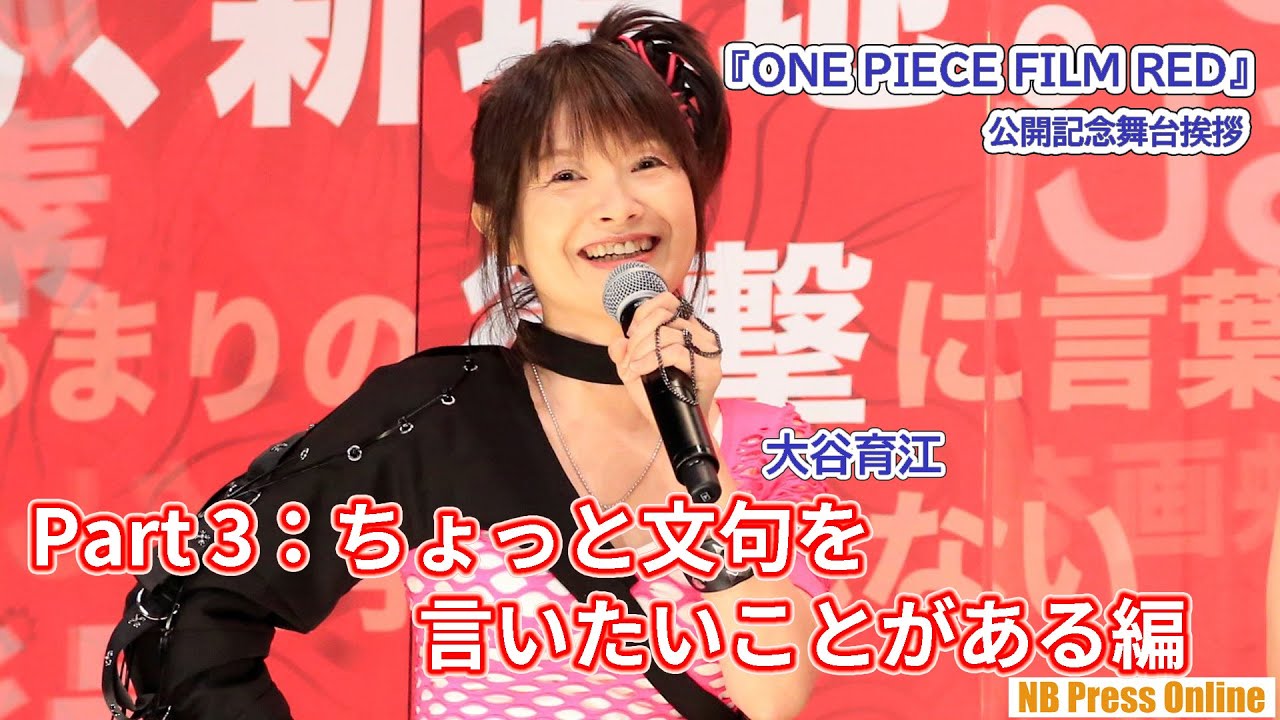 2022年8月13日、丸の内TOEIにて、『ONE PIECE FILM RED』公開記念舞台挨拶が行われ、田中真弓、中井和哉、岡村明美、山口勝平、平田広明、大谷育江、山口由里子、矢尾一樹、チョー、宝亀克寿、名塚佳織、津田健次郎が登壇。8月13日初回上映時点で、興行収入50億円/動員360万人を突破するという大記録を樹立した喜びと共に、観客からの感想コメントについて、キャストが気になったものを明かした。