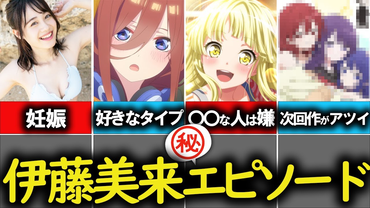 #声優 #五等分の花嫁 #バンドリ #伊藤美来 #三玖 今回は伊藤未来さんについての紹介でした。 よかったらチャンネル登録よろしくお願いします! Tags:三玖五等分の花嫁伊藤未来伊藤美来声優 6 comments 久保さんは僕を許さないが本っ当にむっちゃオススメです!!声優もとても豪華ですし、面白いので、見て欲しいですね〜 動画で紹介されていないアニメの役どころで、アニメを見たのは次の3つですかね!帰宅部活動記録 大萩牡丹のライバル残虐の朱雀役アサルトリリィ!一柳結梨役りゅうおうのおしごと!男鹿ささり役帰宅部活動記録の後半に大萩牡丹のライバルとして登場します。主人公が棒読みとか言われていますがそれなりに面白かった。 スパイ教室は観て❗、みっく好きなら観て❗あやねるも出るから観て❗ 熱愛文春砲きましたね。世の男共これが現実だ。可愛い子はイケメンにお手付きされてるで 内容共々すごいタイムリーな動画になってる…伊藤さん特撮好きが高じて仮面ライダーに生身と声の出演果たしててすごいな 伊藤美来さんは五等分の花嫁で知りました! コメントを残すコメントを投稿するにはログインしてください。