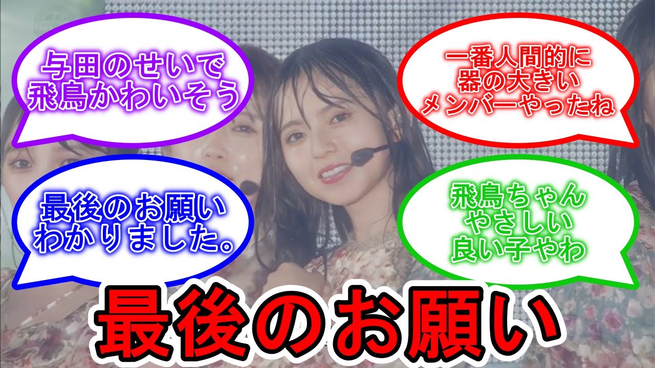 与田の件があろうがなかろうが飛鳥ちゃんに対しては飛鳥ちゃん推しなので笑顔で見届けれる自信しかない。ただ与田のことには笑顔では難しいかなって思う。