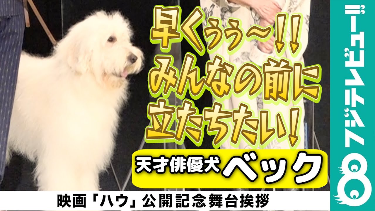 8月20日、映画「ハウ」の公開記念舞台挨拶が行われ、俳優犬ベックと田中圭さんが、客席の通路から仲良く登場しました。