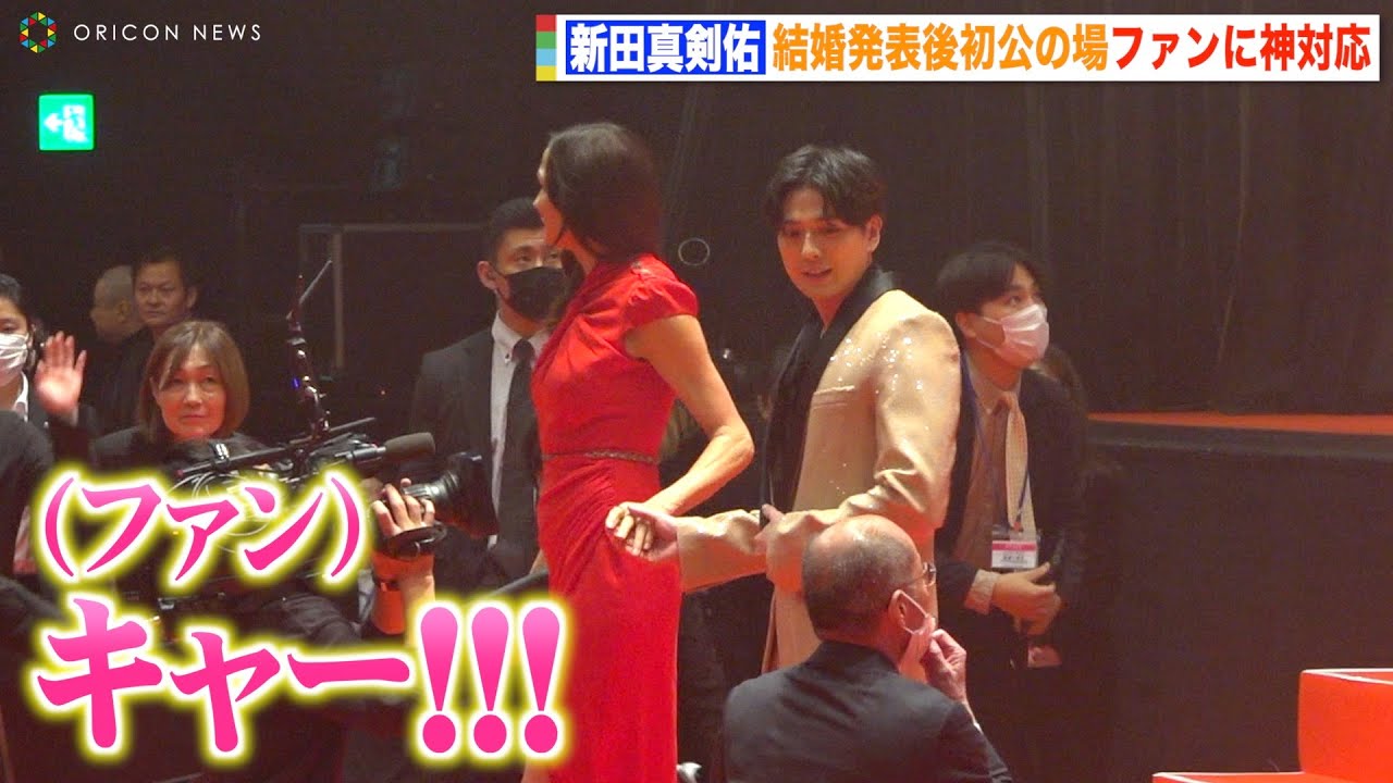 俳優の新田真剣佑が18日、都内で開催された映画『聖闘士星矢 The Beginning』(28日公開)のジャパンプレミアに登場。プライベートでは今年1月22日(2021年8月に亡った父・千葉真一さんの誕生日)に弟・眞栄田郷敦とそろって結婚を発表後、ファンやメディアが集まる公の場に初めて(※編集部調べ)姿を現した新田は、ファンとの自撮りに応じるなど大サービス。公私ともに充実している様子だった。