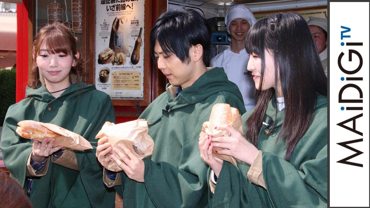 The trio donning the costumes of Investigation army corps tried “expedition foods”, which were a reproduction of dishes in the movie such as “sandwiches and potatoes made with ham and Sasha” stolen from the food court in front of the 4D cinema.”
