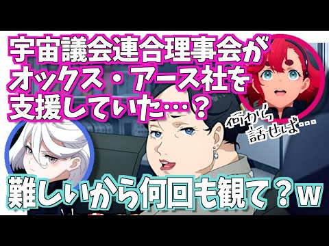 8. シャディクが議会連合強硬派&オックスアースとつながってベネリットを解体するために画策→クエタでテロを起こしたことでクワイエットゼロ頓挫の危機→プロスペラぶち切れで地球でオックス潰す、の流れ。