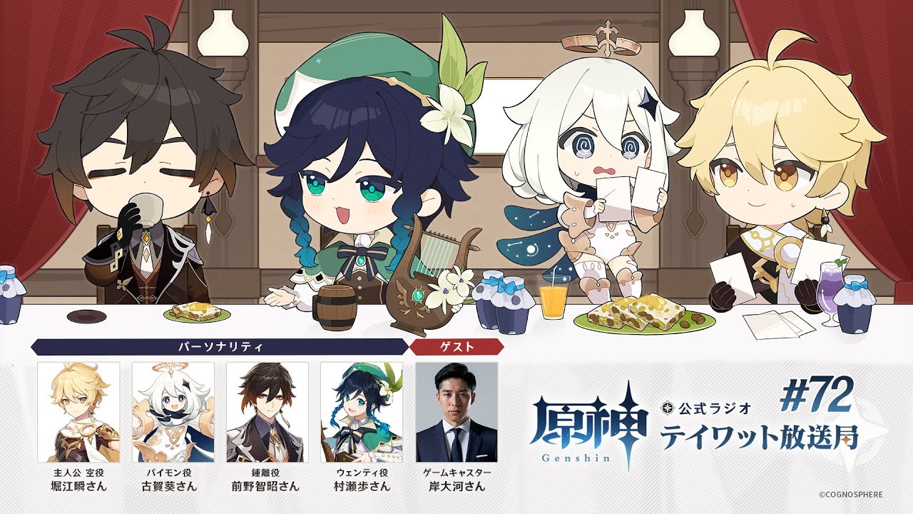 主人公(空)役の堀江瞬さん、パイモン役の古賀葵さん、鍾離役の前野智昭さん、ウェンティ役の村瀬歩さんの4名が入れ替わりでパーソナリティを担当し、「原神」の魅力をお伝えする番組です。