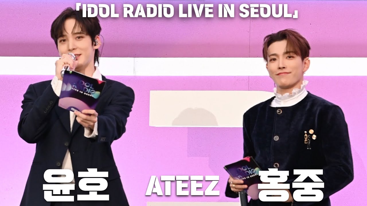그룹 에이티즈(ATEEZ)의 윤호, 홍중이 23일 서울시 마포구 서울월드컵경기장에서 진행된 ‘IDOL RADIO LIVE IN SEOUL(아이돌 라디오 라이브 인 서울)’에서 진행을 하고 있다.