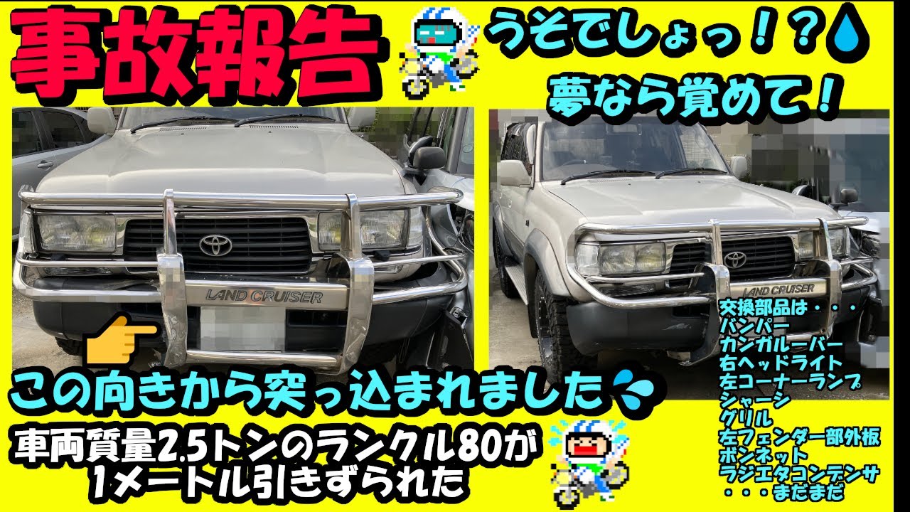 車両 : 平成7年(1995年) トヨタ ランドクルーザー 80 ガソリン車 FZJ80G 内容 : 事故報告 作業 : 無し みなさんこんにちは。JIN(ジン)です。 最悪な事が起きました。。。事故です。 停車中のトヨタ ランドクルーザー80に軽自動車が突っ込みました。 さぁ、どうしようか。。。 <おねがい> 整備・修理・部品交換など、自己責任でお願い致します。 <商品紹介> 無し #事故 #ランクル80 #FZJ80G Tags:#トヨタFZJ80Gジン(JIN)ハチマルフロントランクル80ランドクルーザー80事故 コメントを残すコメントを投稿するにはログインしてください。