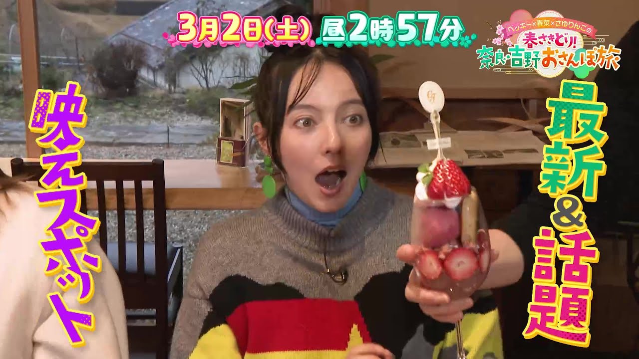 ベッキー、ハリセンボン 近藤春菜、元乃木坂46の松村沙友理が、観光特急「青の交響曲(シンフォニー)」で全国屈指の桜の名所として知られる奈良・吉野へ!吉野山のシンボル、世界遺産・金峯山寺で神秘体験!新名物!?絶品グルメはもちろん、春だからこそ見られる美しい景色まで!最新&話題のスポットを巡る極上の癒し旅をお届けします。