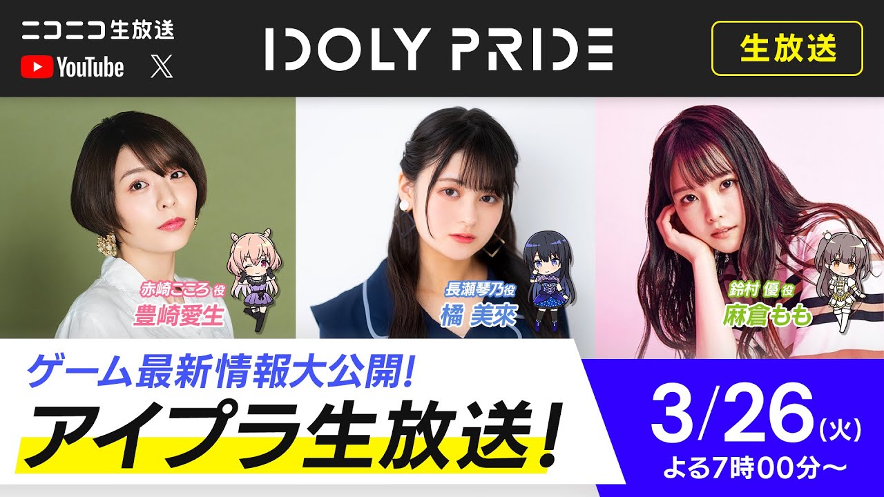 赤崎こころ役の豊崎愛生さん、長瀬琴乃役の橘美來さん、鈴村優役の麻倉ももさんがゲームの最新情報をお届けいたします!!