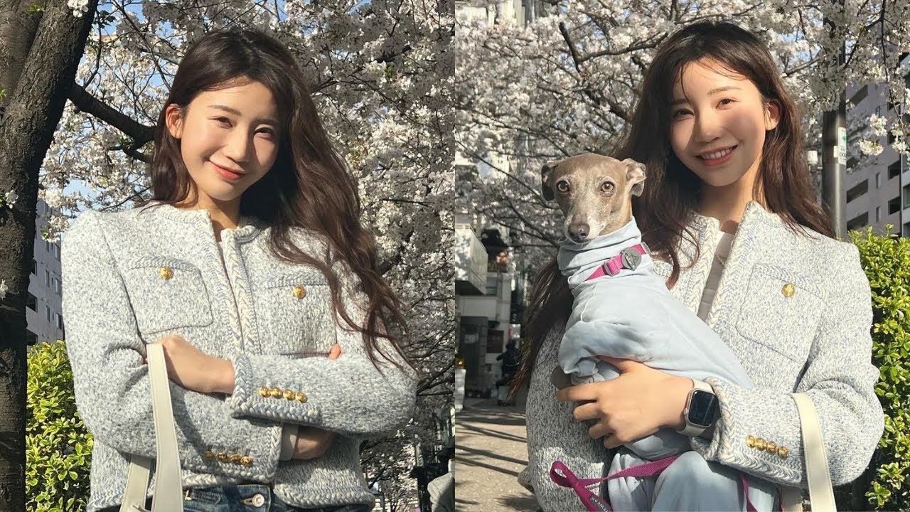 In the post, she wrote, “Cherry blossoms are in full bloom in Tokyo,” and showed a shot of her wearing a light blue spring-like tweed jacket with denim, with her arms crossed against a cherry tree and her dog in her arms.