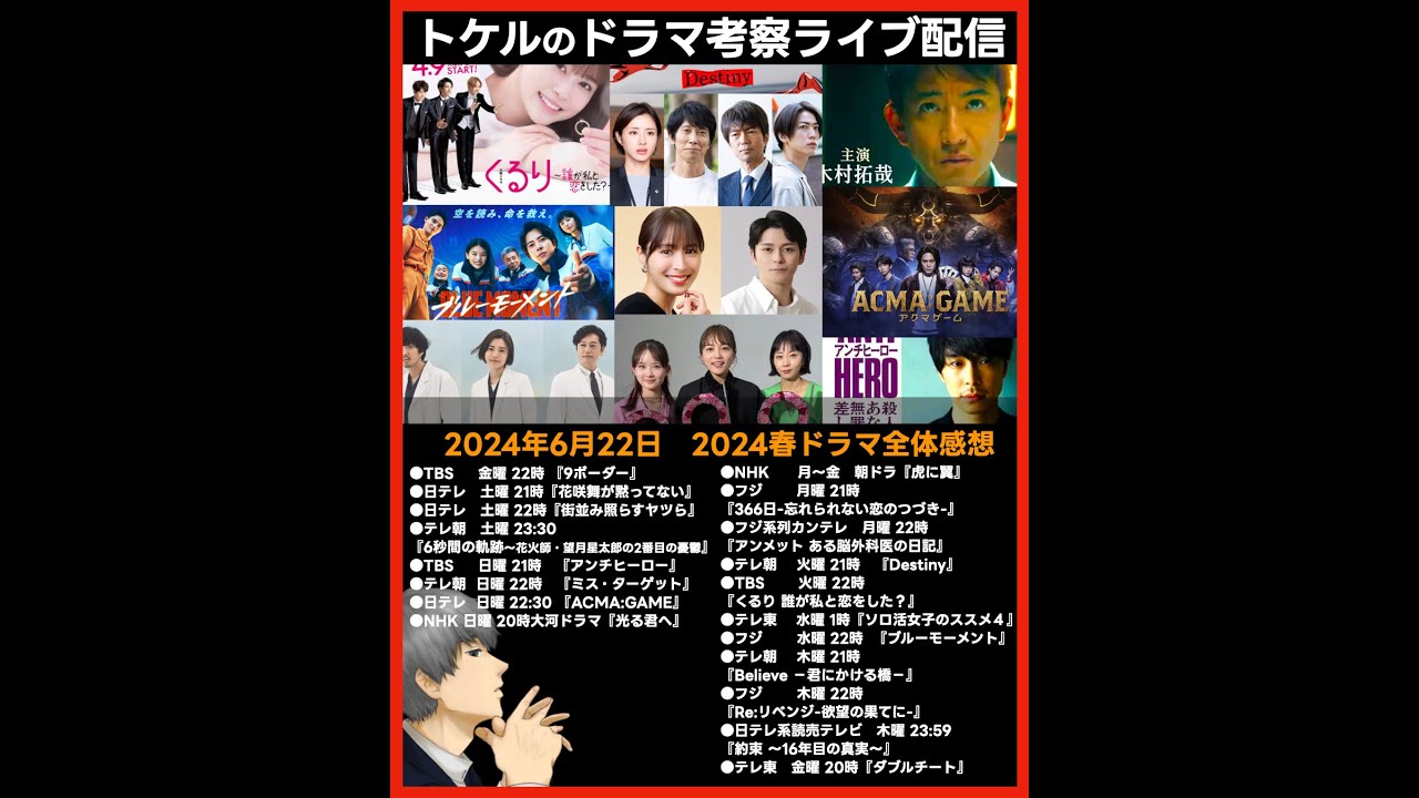 #春ドラマ #2024春 #ドラマ #366日 #アンメット #Destiny #くるり #ブルーモーメント #Believe #アンチヒーロー #アクマゲーム #イップス #9ボーダー #花咲舞が黙ってない #光る君へ #虎に翼