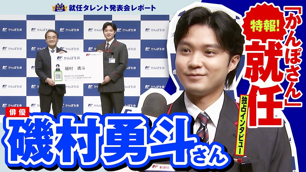 発表会では、今回就任が決まった俳優の磯村勇斗さんに巨大なかんぽ生命の名刺が送られ、「かんぽさん」を演じることへの想いや意気込みを語ってくれました。