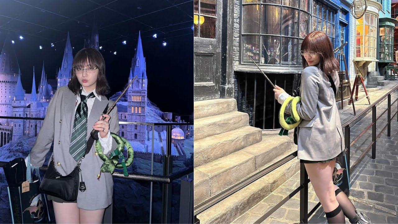 In her post on that day, she wrote, “The face, the atmosphere, and the combination diagnosis all Slytherin, snake-loving woman,” and showed several shots of her enjoying the world of Harry Potter, wearing glasses, a shirt and tie, a very mini skirt, and a gray jacket in a coordinating outfit.