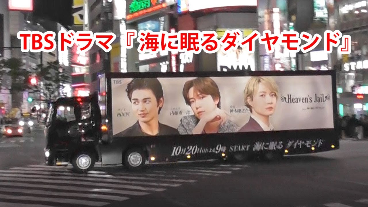 渋谷を走行する、神木隆之介が主演する、TBSドラマ『海に眠るダイヤモンド』ホスト風のアドトラック