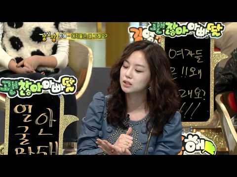 CW was voicing her opinion in response to Donghae's story of loving a woman for years and not getting her love back. CW said that women initiating then withdrawing then initiating in a relationship is a natural instinct, not a matter of how much love there is. After breaking up/looking back, those "bad guys" are just a page in their lives, women will not keep the "bad men" in their hearts, but always remember the men who sincerely treated them well. Her conclusion: Bad men can be chewed (her term was funny/strange given her soft demeanor and elegant tone) on, but good men, you can't. Everyone laughed b/c she said "chew" a little weird, and the term was surprising coming out of her mouth. I think she meant you could chew and spit a bad man back out, but shouldn't do that to a good guy. 😆 This is quoted from moon chae won fan page in soompi. I have no credit but just to share if any moonies are watching our girl funny clip.