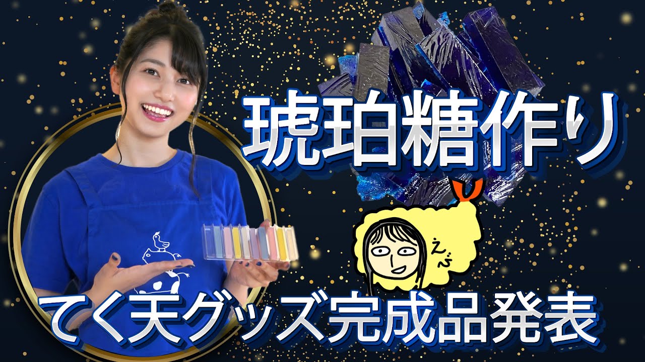 無事に青い琥珀唐が完成した瞬間にてく天グッズの紹介の中にてく天ゆるキャラが印刷された抱き枕がもふもふして気持ち良く寝られそう絶対買います。