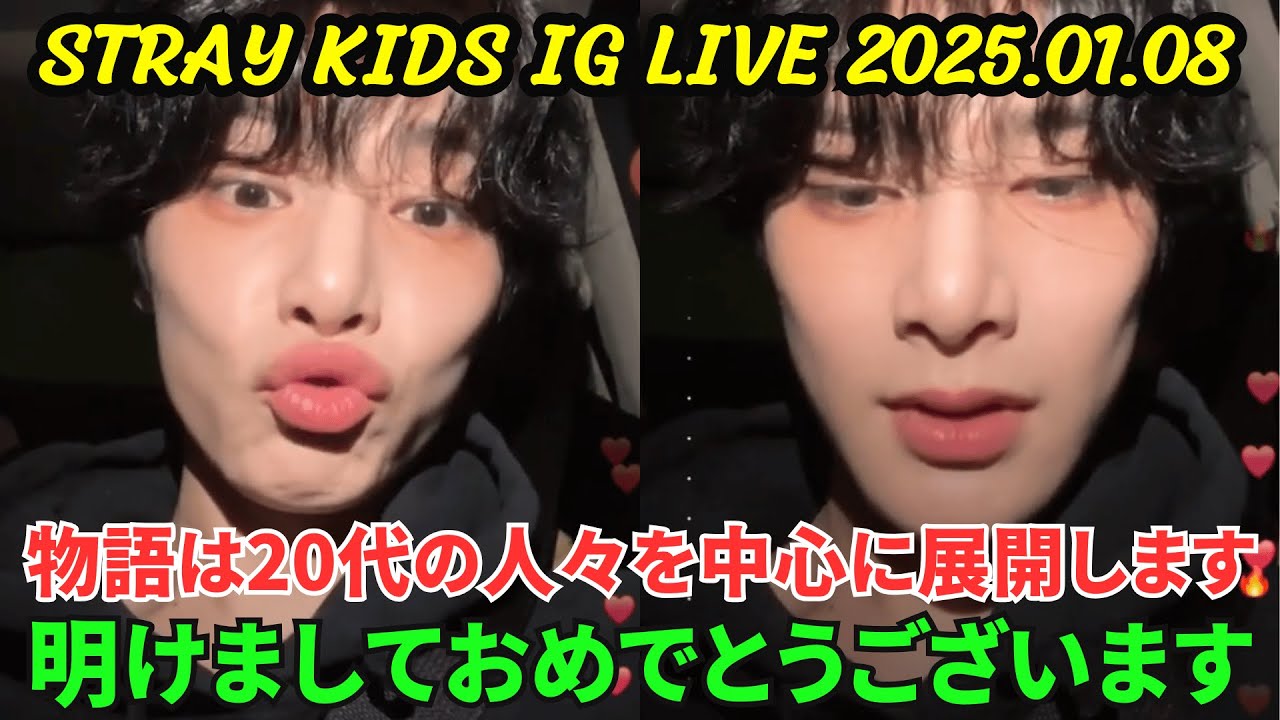 【STRAY KIDS】 INSTAGRAM LIVE 2025.01.08 。ライブ配信するアイエン(I.N)。明けましておめでとうございます… 物語は20代の人々を中心に展開します。