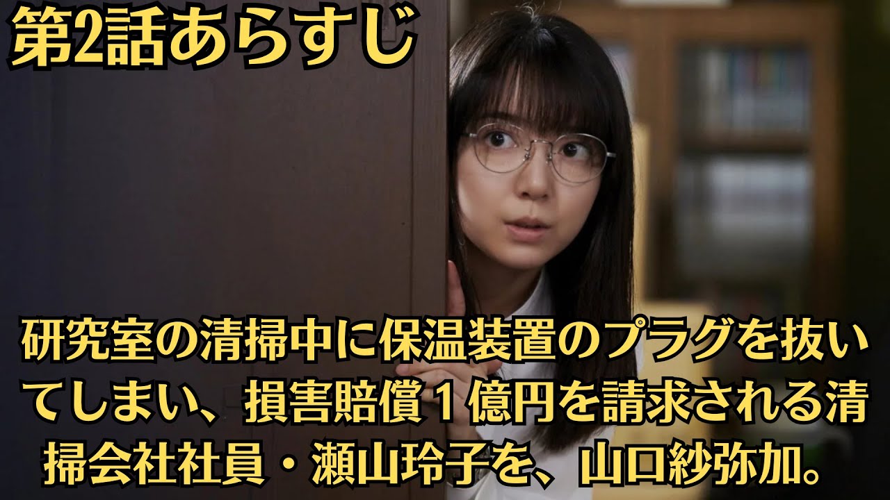 ■第2話は、研究室の清掃中に保温装置のプラグを抜いてしまい、損害賠償1億円を請求され​る清掃会社社員・瀬山玲子を、山口紗弥加。​玲子個人を訴える英央大学理学部教授・倉敷隆文を、加藤雅也。​